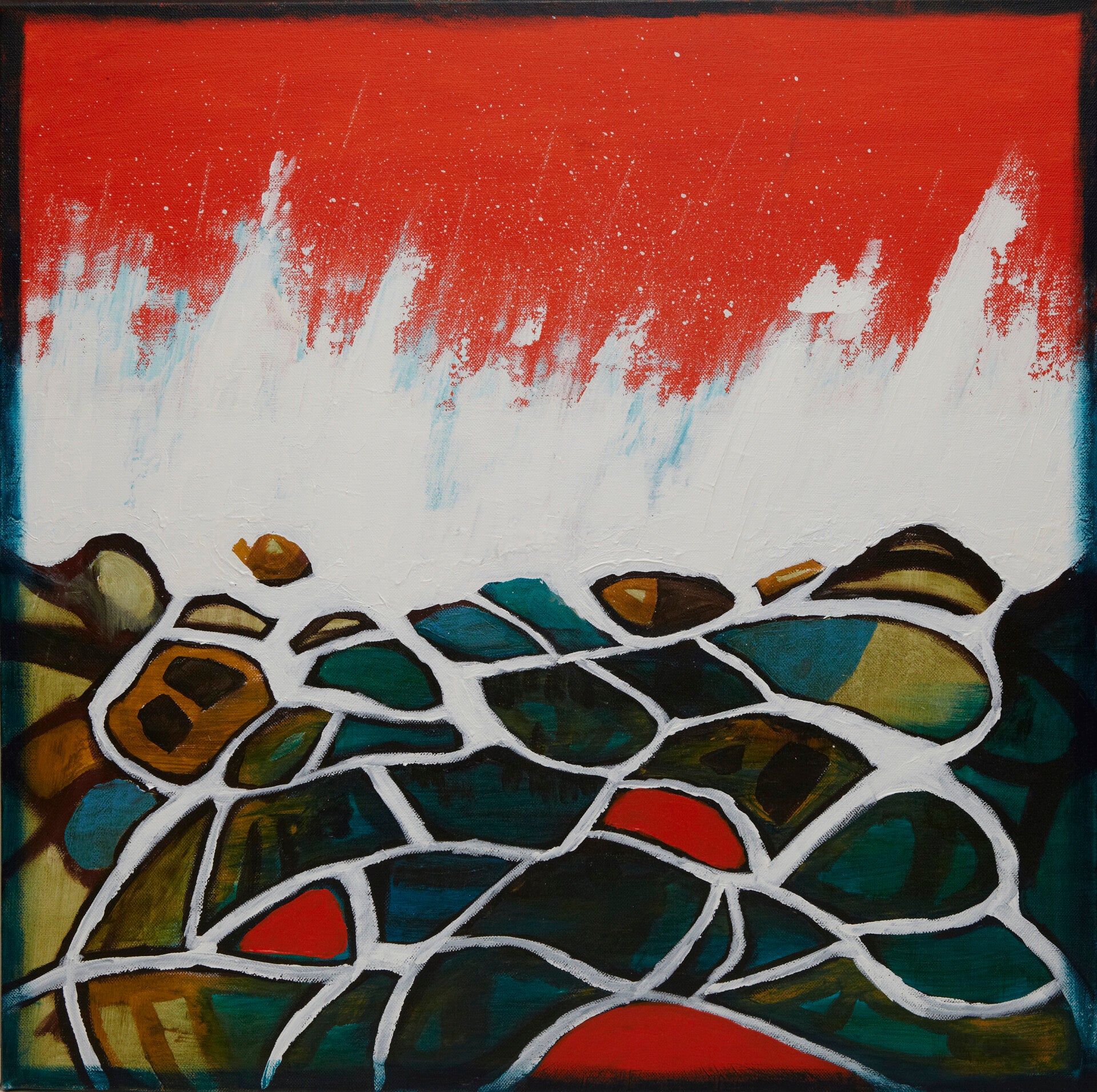 Painting of an abstract rocky shoreline and stormy incoming tide with a backdrop of an orange sky suggesting a late evening and heavy sea.