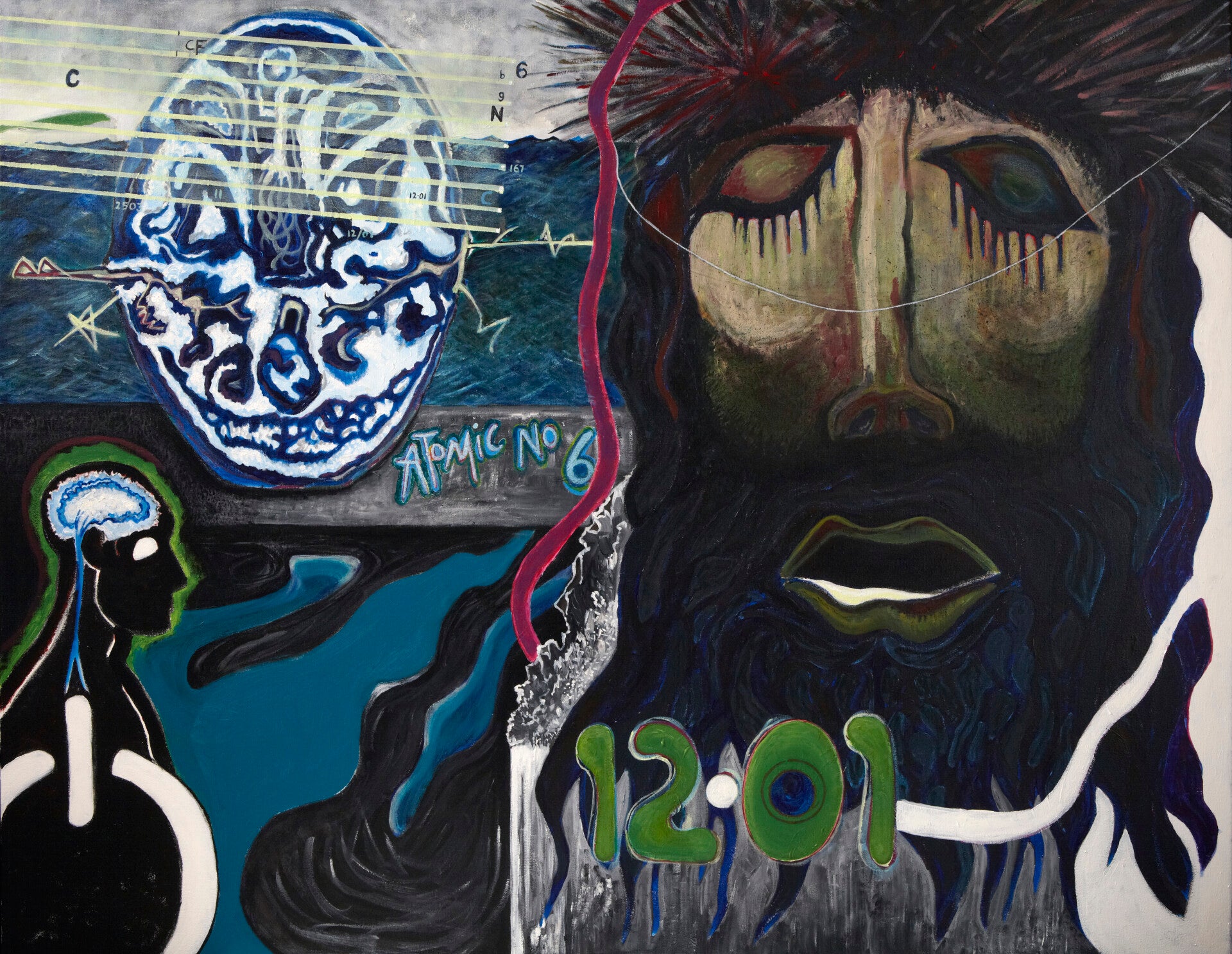 Carbon 12 is a powerful surrealist painting that blends abstract symbolism, science, and spirituality into one captivating composition. The artwork features a glowing blue brain and atomic elements balanced against a haunting, contemplative face — a visual dialogue between intellect and emotion, life and decay.